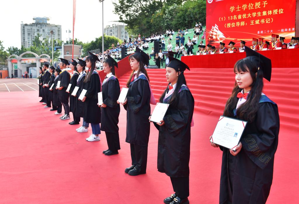 王斌为我校具有谦虚谨慎,不骄不躁,不忘初心,持续奋斗代表精神的李锦秀、罗秋凤等13名省级优秀毕业生代表授位。