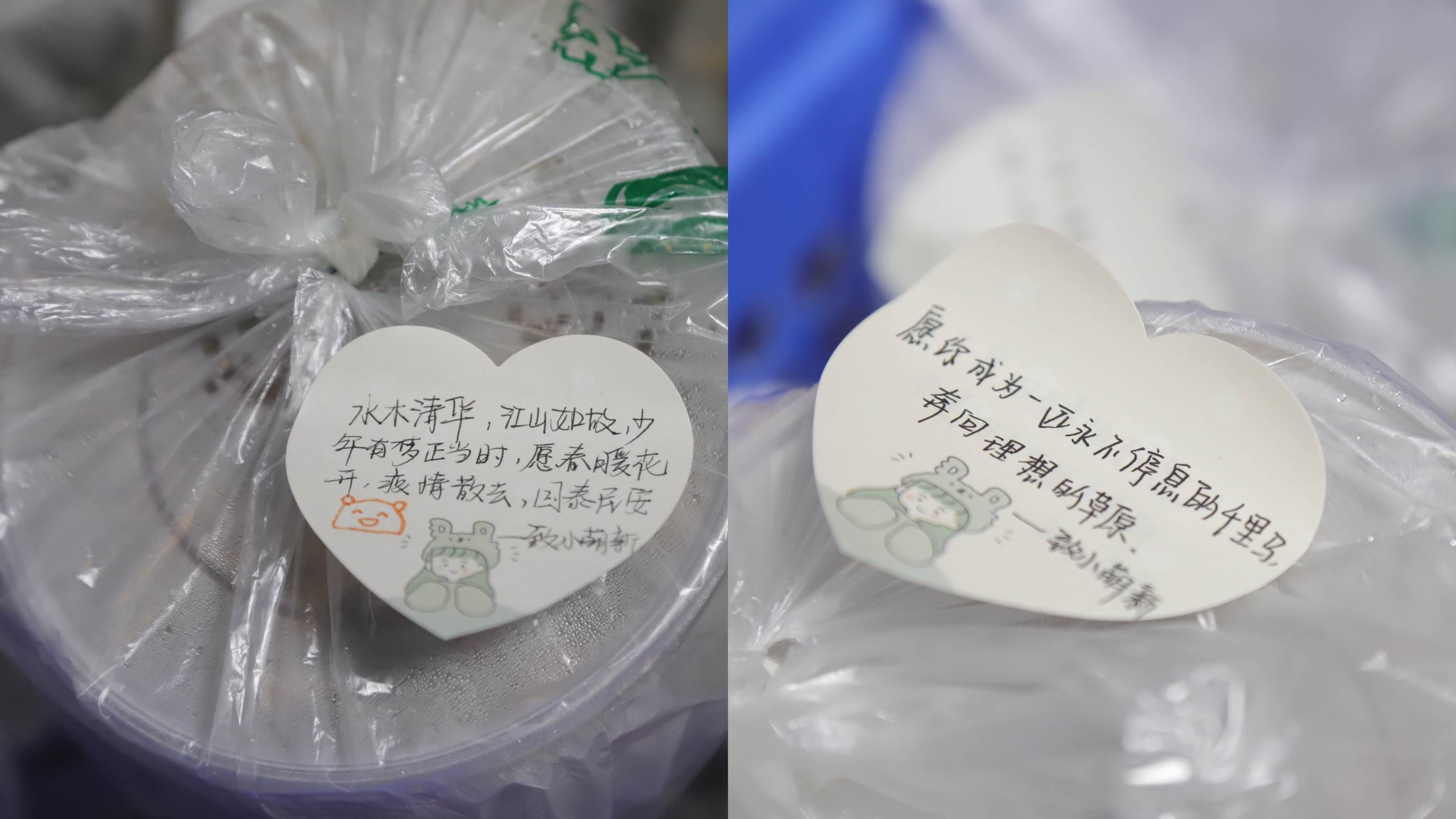 用心的服务保障。后管处协调学校各食堂、生活超市为到校新生做好供餐保障,从清晨3点开始准备早餐到晚上坚守到为最后一批新生提供热食饭菜。食堂工作人员、公寓管理人员、师生志愿服务队,严格按照疫情防控要求将新生的餐食无接触配送到新生寝室,并整齐摆放在寝室门口的凳子上,送上暖心提示纸条。