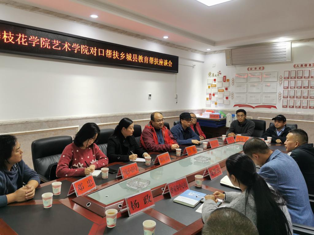 10月24日下午,不顾路途的疲惫和高原反应,彭徐一行与乡城县教育和体育局开展了攀枝花学院艺术学院对口帮扶工作座谈会,就艺术学院对乡城县开展技能培训和校园文化打造进行了交流。乡城县教体局负责人对攀枝花学院一直以来的帮扶工作表示感谢,并表示参加了2019年音乐、美术培训的教师在今年乡城县举办的中小学艺术节中大放异彩,前期墙绘工作也受到了各个工作组的称赞。彭徐提出,此次校园文化打造要与乡城特色文化相结合,培训教师要认真备课、上好每堂课,保质保量完成培训任务;下一步工作要向乡村振兴、文化振兴方向发展。