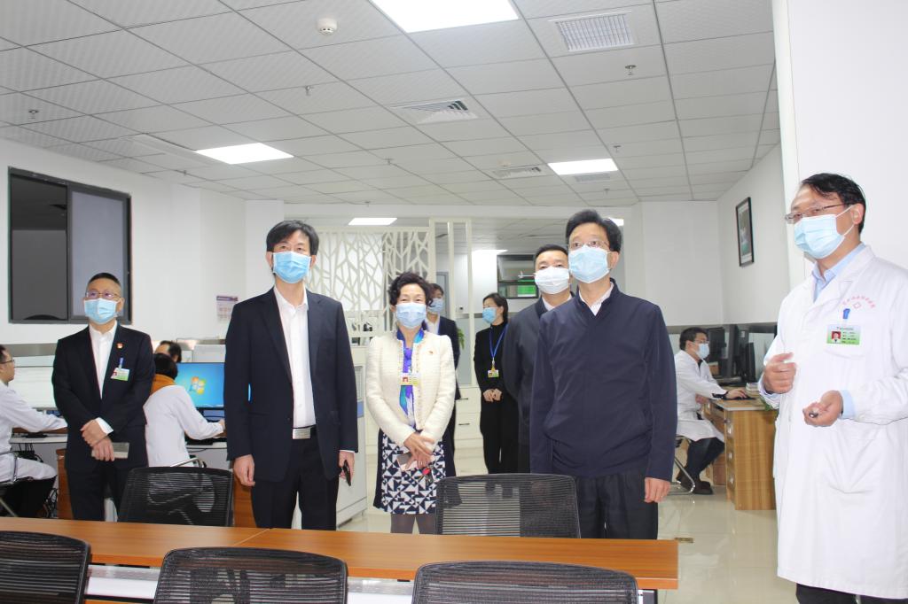 王斌一行先后到急诊科·胸痛中心、影像中心、核医学科、康复医学中心、体检中心、美容科、治未病中心、远程中心、一站式服务中心、融合健康广场、手术直播间、肿瘤科安宁病房、心内科、心胸外科,了解了医院基本情况和学科发展、中医药能力提升、智慧医疗服务等工作情况。