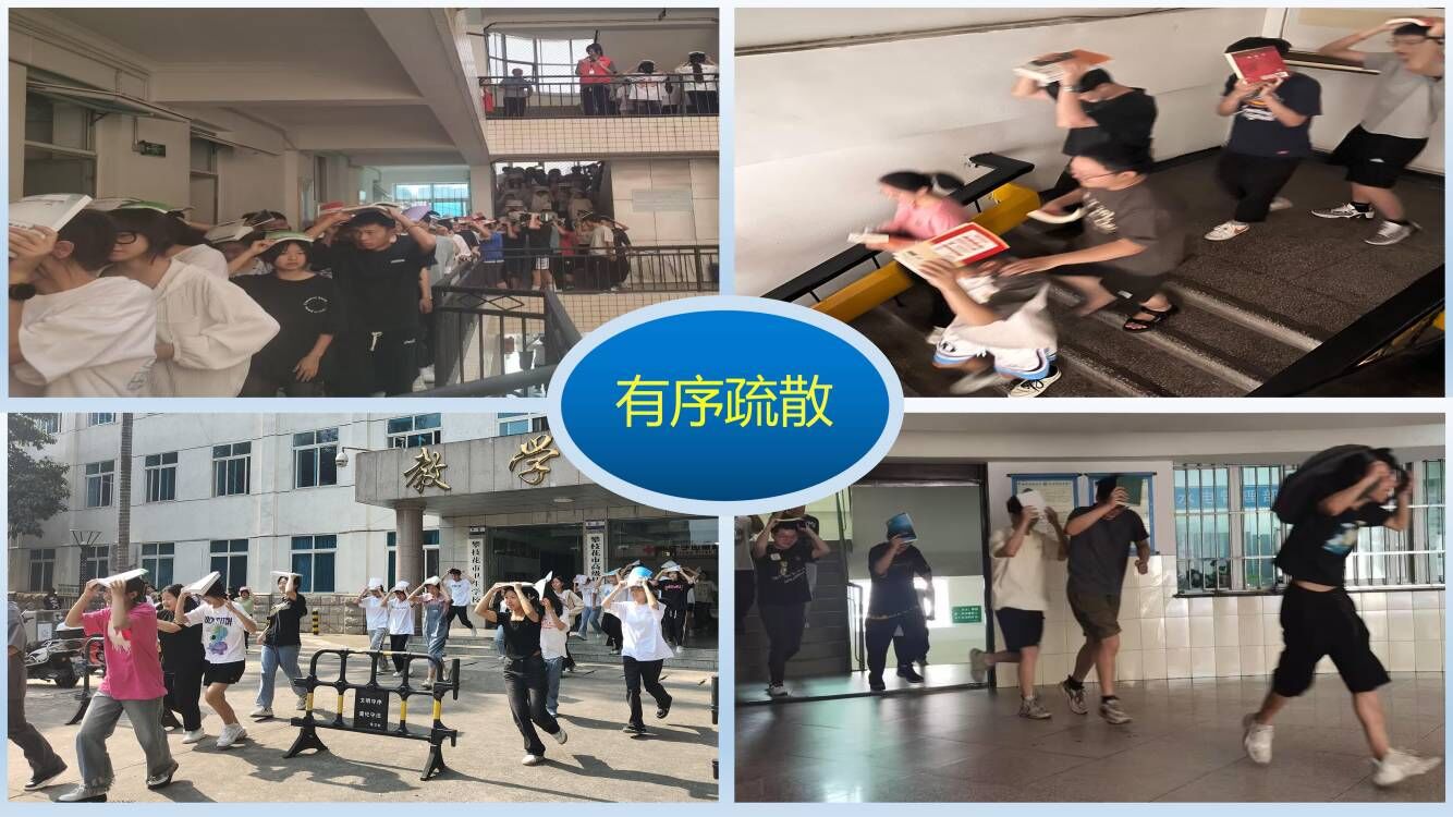 30秒后,模拟第一次地震波结束,在授课教师、志愿者和公寓管理员等指引下,学生们迅速从教室、寝室、图书馆、实验楼等地有序疏散。