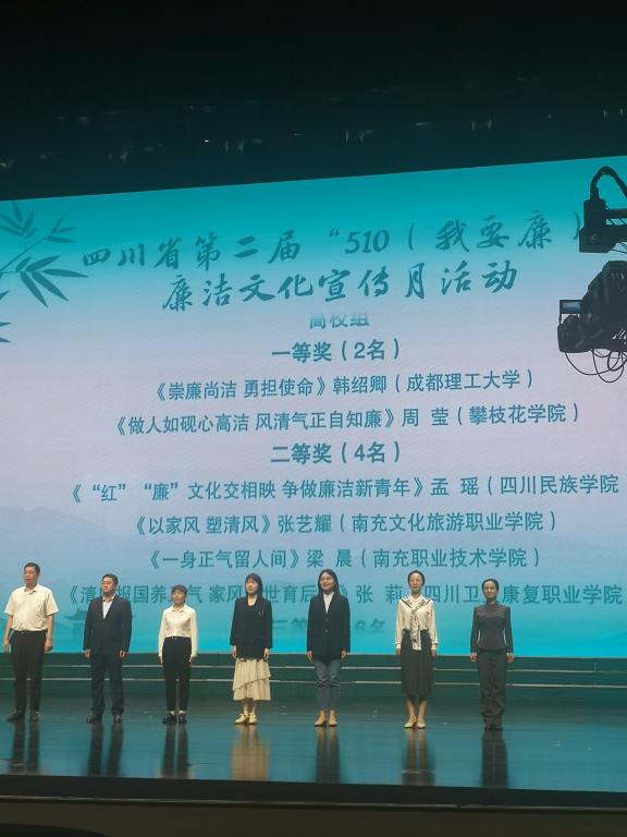 5月10日,由省纪委、省委宣传部、省教育厅举办的四川省第二届“510(我要廉)”廉洁文化宣传月活动在眉山正式拉开帷幕。启动仪式暨成果发布会对活动形象大使和主题形象歌曲进行发布,对“510”活动前期作品征集评选情况进行公布和颁奖,对全省廉洁文化建设成果进行集中展示。我校文学院周莹老师“廉洁教育进校园”思政微课大赛获得一等奖。