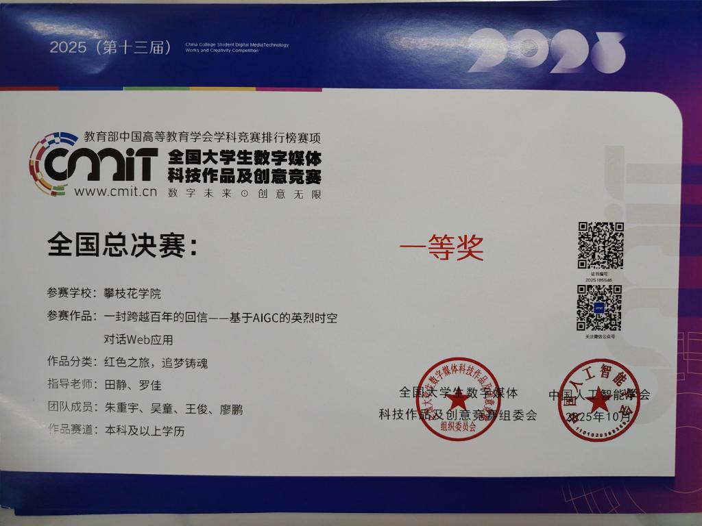 10月25日,“2025年(第十三届)全国大学生数字媒体科技作品及创意竞赛”全国总决赛在哈尔滨举行,我校生化学院(农学院)参赛团队(团队成员:朱重宇、吴童、王俊、廖鹏;指导教师:田静、罗佳)凭借作品《一封跨越百年的回信——基于AIGC的英烈时空对话Web应用》荣获全国总决赛一等奖,指导教师田静获“优秀指导教师”荣誉称号。