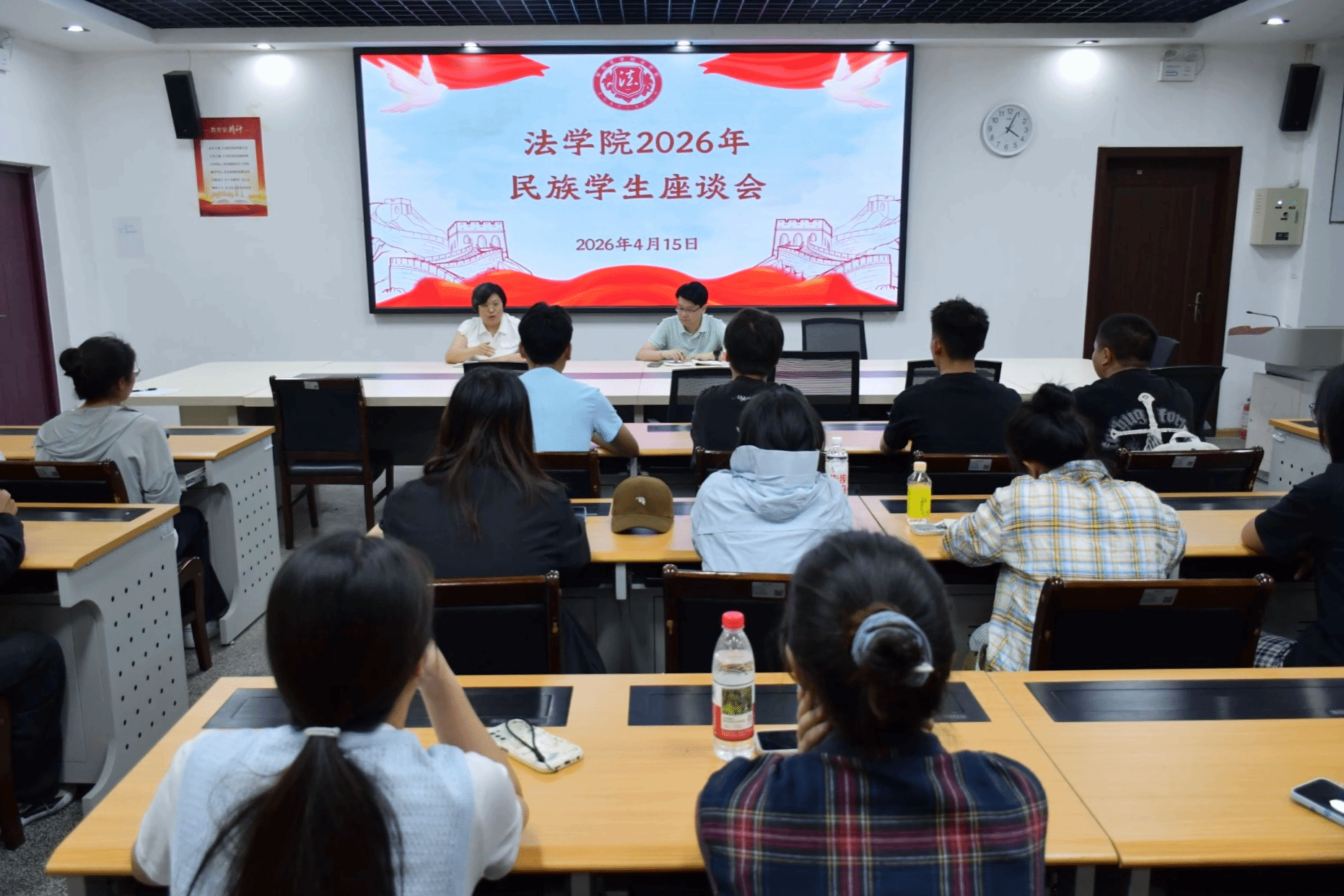 为落实学生管理要求,精准服务学生成长,强化校园安全建设。4月15日下午,法学院在凌云楼3-1会议室,先后召开2026年退役大学生座谈会、民族学生座谈会及安全教育专项大会。法学院党委书记张琳主讲,学生科科长兼分团委书记刘沙,退役大学生、各民族学生代表、团学组织各部门代表及各年级各班负责人参会。