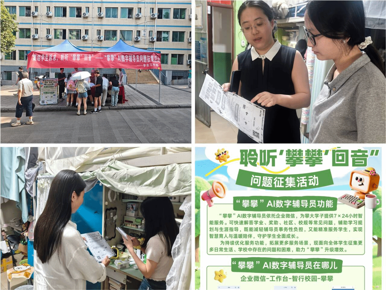 为持续深化“一站式”学生社区综合管理改革,深耕智慧育人主阵地,以数字化赋能学生工作提质增效,4月23日,学生工作部面向全体在校学生开展“攀攀”AI数字辅导员功能优化专项意见征集活动,精准摸排学生园区生活、寝室住宿、学业发展、事务办理等方面实际困难与合理诉求,推动暖心服务、智能服务直达社区一线、直达学生身边。