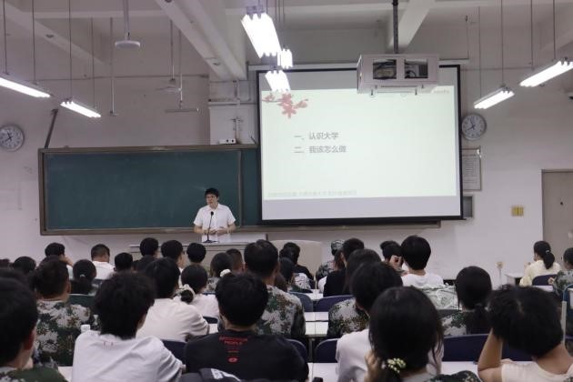 数计学院党委副书记姜承琳用《以自律自觉自强为基,开启阳光健康美丽人生》为题,从认识大学引入,指出进入大学要明白高中和大学的不同,要意识到角色的转变,以自律自觉自强为基,争做阳光健康美丽的攀大学子。