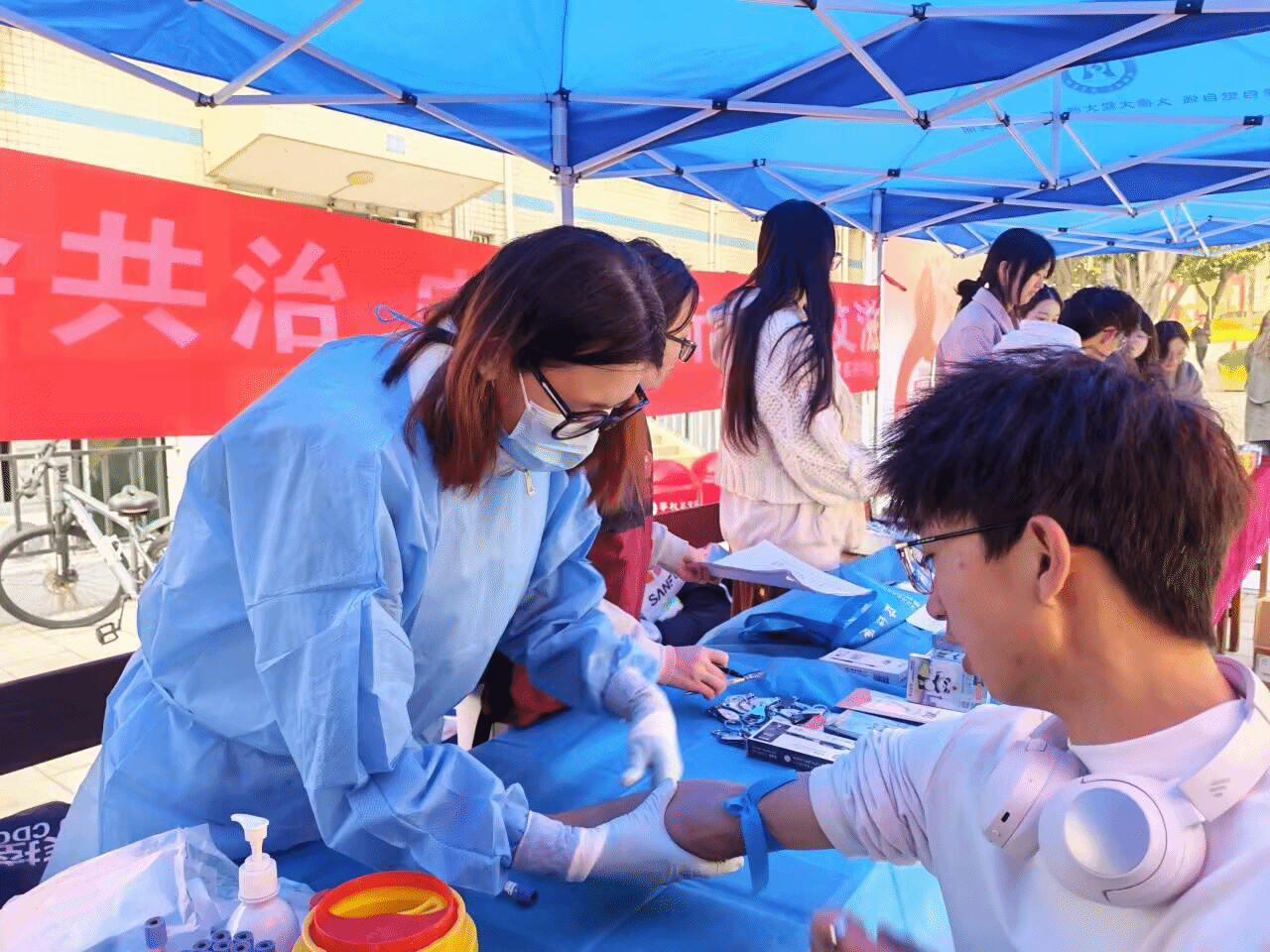 12月1日至2日,东华山校区和公园校区学生社区同步启动现场宣传活动。活动现场设置主题签名墙、防艾科普展板,志愿者累计发放宣传资料1000余份,通过防艾知识问答、红丝带手工制作等互动形式,让科学防艾理念在趣味参与中扎根人心。市、区疾控中心专业人员现场提供免费保密检测与一对一咨询服务,近500名学生主动参与咨询检测,主动筑牢自我防护屏障。